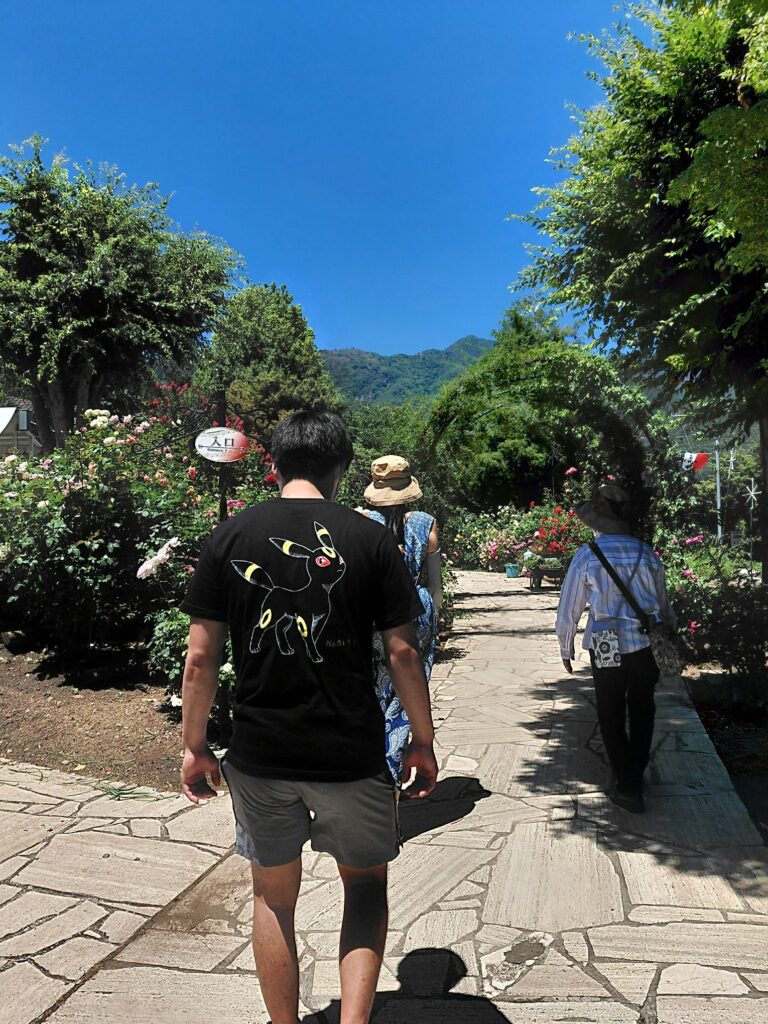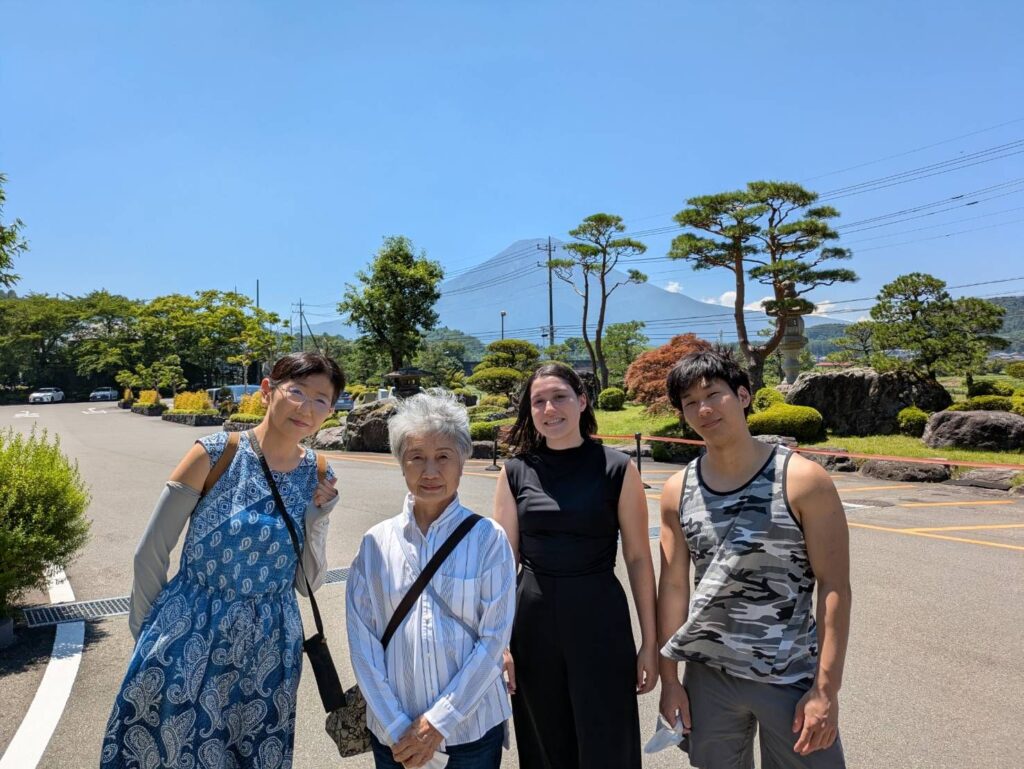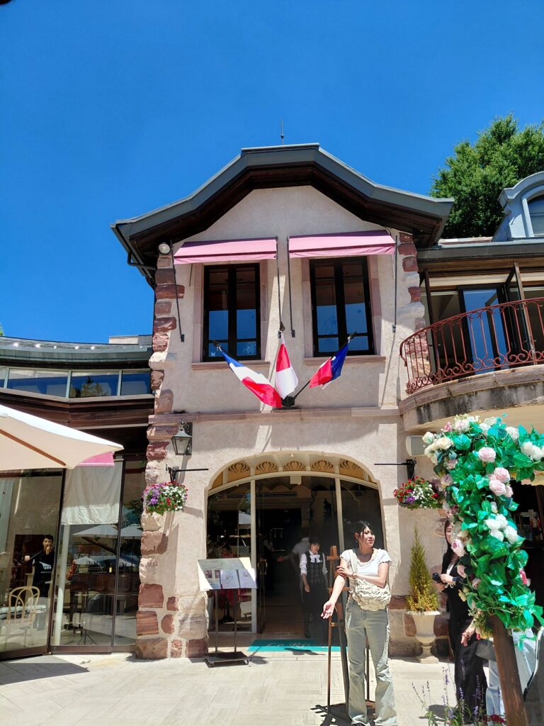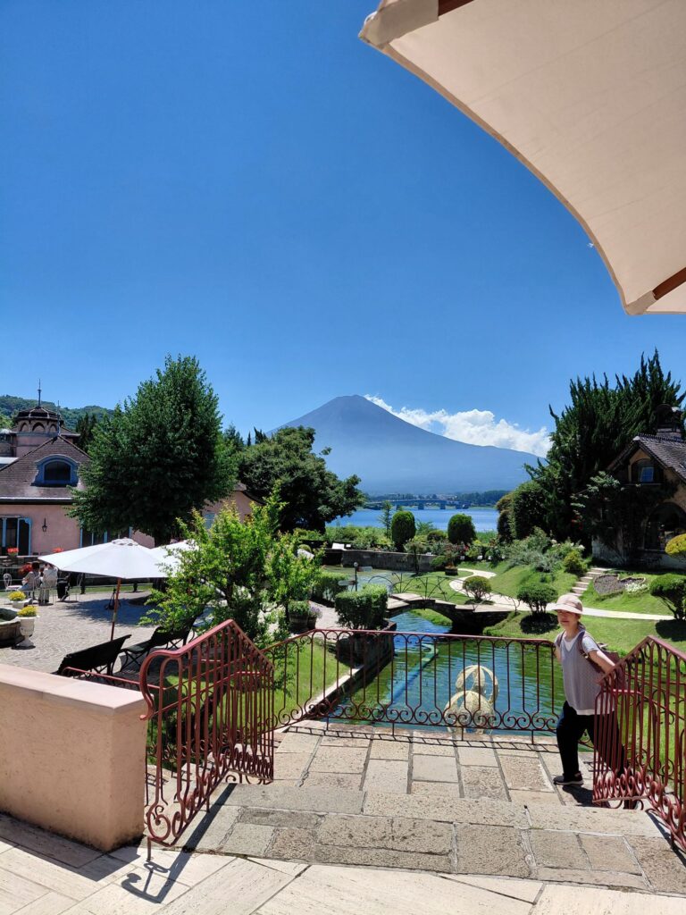 Après ça, pour la suite du voyage, la tante de Hibiki nous a emmenés dans un musée de musique à Kawaguchiko, consacré aux instruments automatiques, un peu comme des boîtes à musique géantes. Le musée s’appelle Kawaguchiko music forest. C’était un endroit surprenant : en fait, le musée est conçu comme un petit “village” inspiré de la France… mais la France de l’époque monarchique, plutôt style Versailles que Paris d’aujourd’hui. En arrivant, j’ai trouvé ça vraiment très joli et plein de charme. On pouvait même louer des robes de princesse pour la journée afin de se promener et prendre des photos dans ce décor. Franchement, ça aurait pu être amusant, mais vu la chaleur, je n’ai même pas envisagé l’idée ! Ce qui m’a surtout marquée, c’était le contraste : se promener dans un décor inspiré des villages français, avec en arrière-plan le Mont Fuji majestueux… c’était presque irréel, mais vraiment très beau.