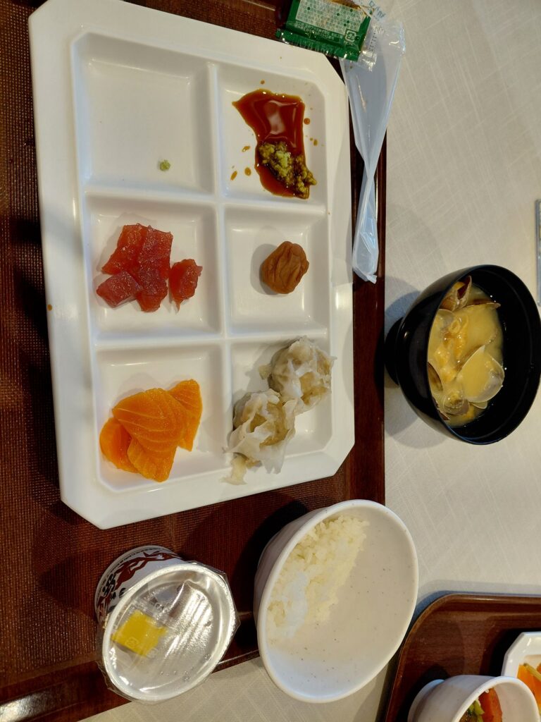 J’ai bien mangé, même si le matin je n’ai jamais un très grand appétit (dommage, parce que ça valait le coup de goûter à tout !). J’ai quand même pris un peu de chaque : du sucré, du salé, et même des sashimis… oui, des sashimis au petit-déjeuner ! C’est fou quand même. Tout était vraiment délicieux.